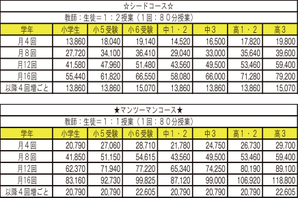 ■個別指導では、シードコース(1対2授業)とマンツーマンコース(1対1授業)がございます。下記の料金表では、上がシードコースの料金表、下がマンツーマンコースの料金表となっております。