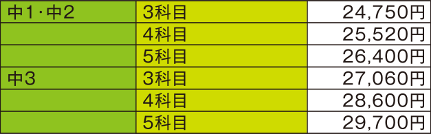 ※3科目のコースの場合は、下記の表では英・数・国の3科目になっておりますが、英・国・社や国・理・社などの変則的な科目選択も可能になっております。